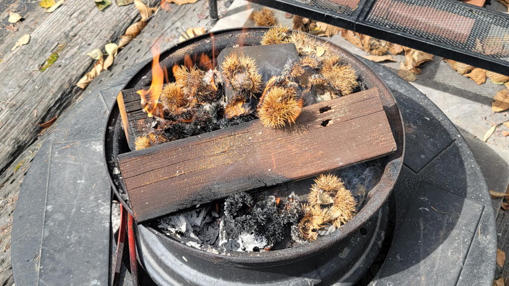 午後2時過ぎから、山栗のイガを燃やすこの時期特有の「焚き火」を楽しむ。