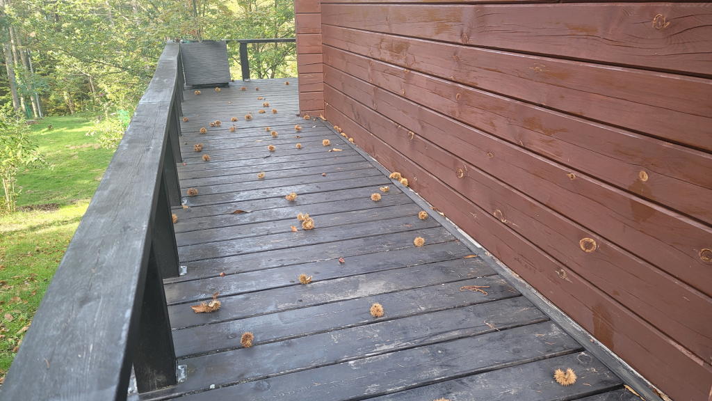 オフィスのウッドデッキの上には、山栗のイガが散乱していた。