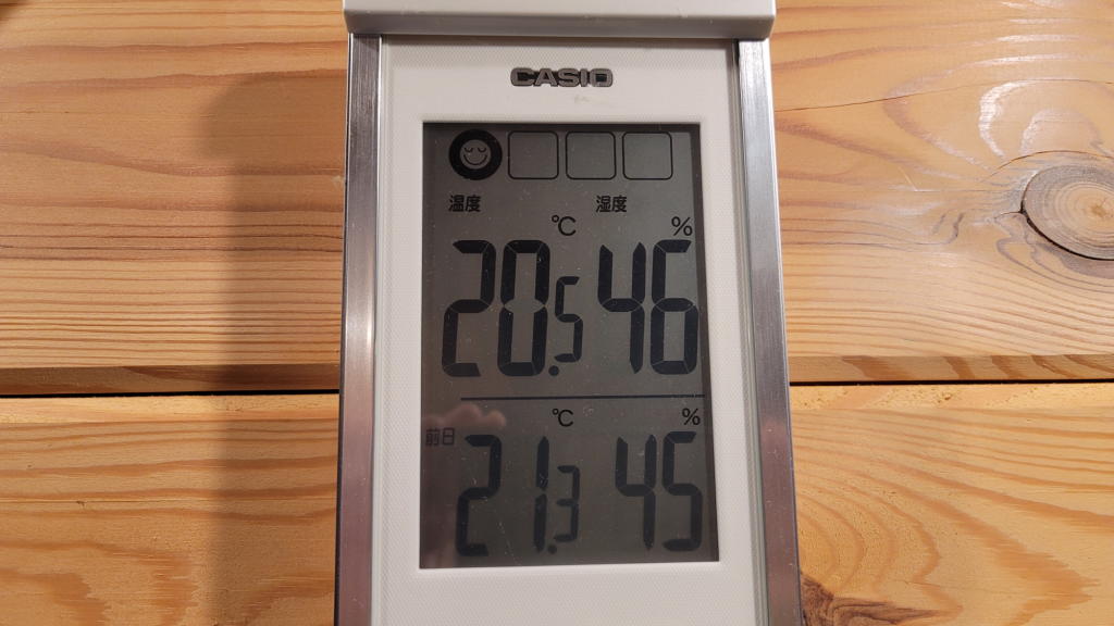 午前8時過ぎのオフィスの室温は20.5℃、一方、外(オフィスウッドデッキ)の気温は15.2℃。