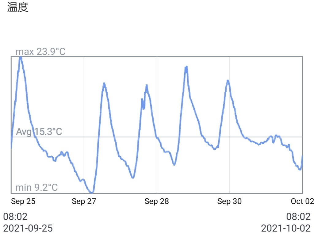 外気温モニターの記録は、私が自宅に滞在していた9月27日の早朝に、気温は一度、10℃を割り込んで9.2℃まで低下した事を示していた。