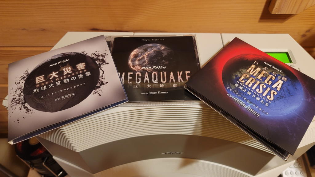 すると、NHKスペシャルのメガ3部作「MEGAQUAKE」「MEGA DISASTER」「MEGACRISIS」のサントラが並んでいるのを発見。