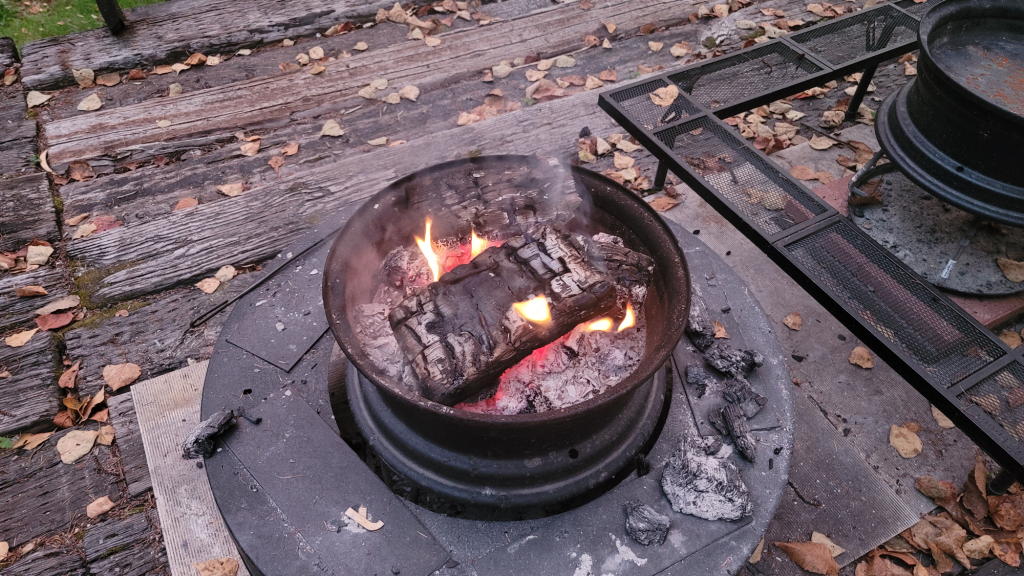 夕方のマシンウォーキングの前に焚き火に着火。