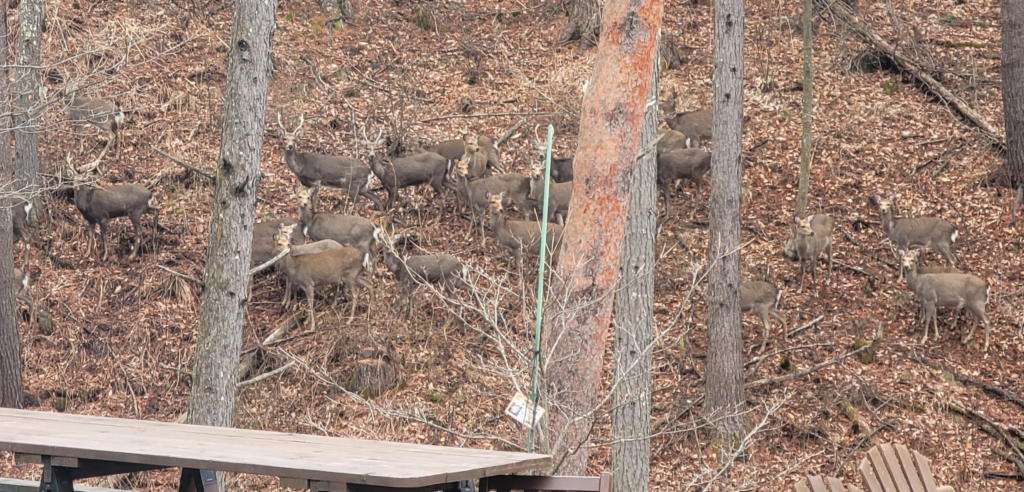 財産区林や庭に出没する鹿は、通常、「群れ」を形成している。7~8頭から、多い時は20頭を超す事もある。