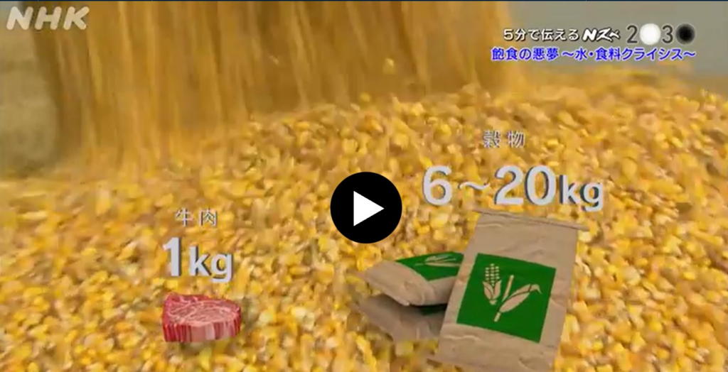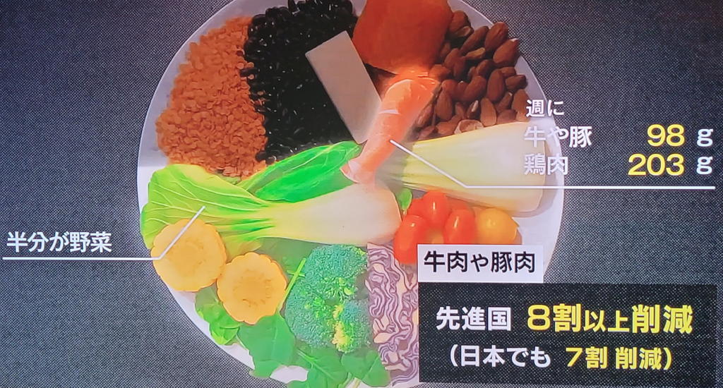 「半分が野菜で、週に牛肉・豚肉が98g、鶏肉が203g」、牛肉・豚肉については、先進国では現状の8割以上の削減が必須との事。