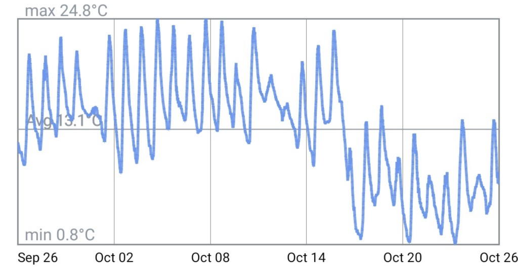 早速、オフィスウッドデッキに設置した温湿度計モニーターで過去1ヵ月の外気温推移をチェック。