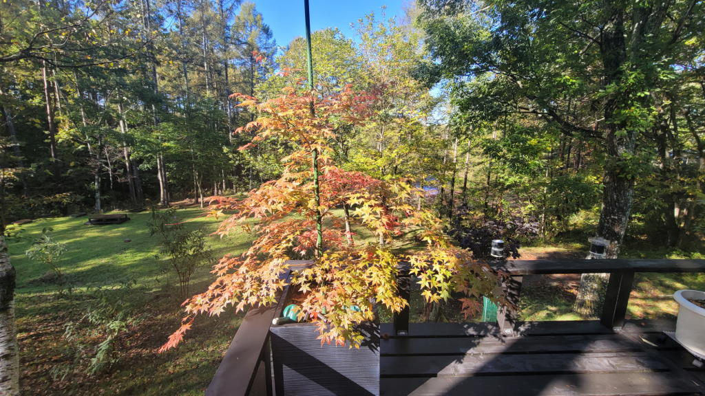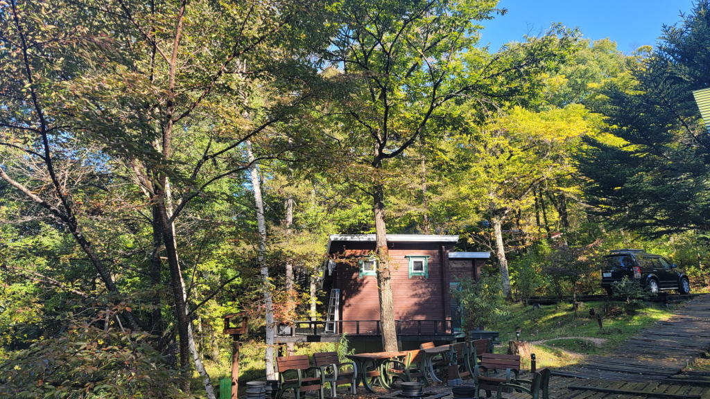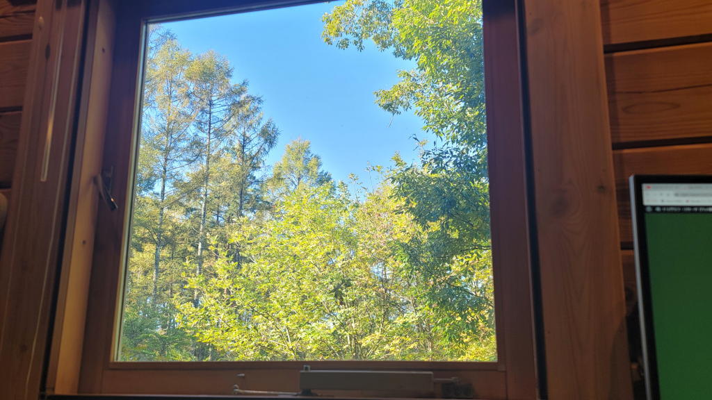 朝の7時過ぎにオフィスのデスク前のブラインドを上げたら、そこには、漸く紅葉が始まりかけた庭の木々と八ヶ岳ブルーの空が広がっていた。