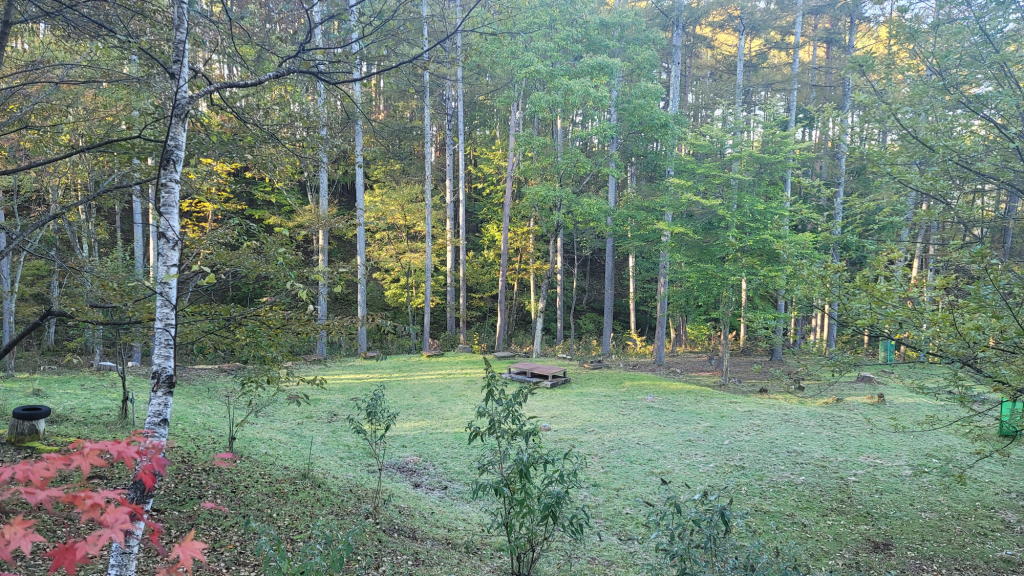 フラットな芝生スペースが霜に白く覆われて、それが財産区林の樹間から朝陽に照らされて、まだらに輝く光景は、結構味わいがあるのだ。