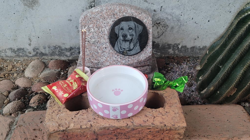 早速、庭に出て、お墓をきれいに掃除して、カリンが大好きだったクッキーやお水を新しい物に換えた。