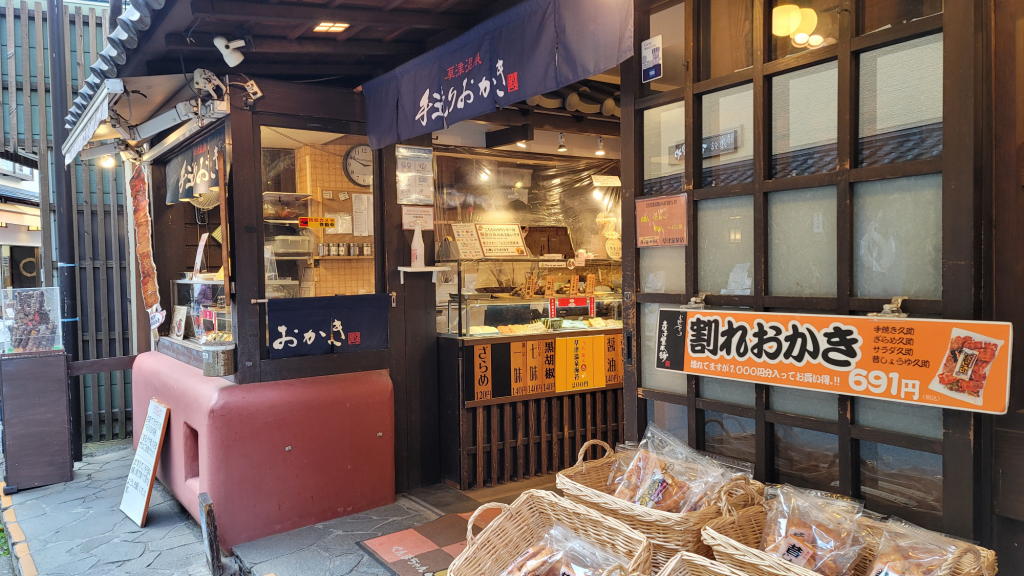 その後、温泉街をいつもと同じルートでノンビリと歩いて回って、帰路で「寺子屋本舗」で焼きたての手造りおかきを買った。