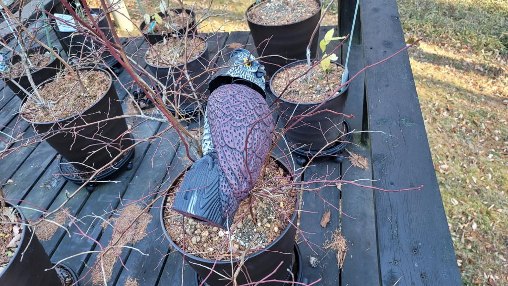庭に出てみると、この夏、ずっとブルーベリーを見守ってくれた「ぶっき~ちゃん」が風に飛ばされて、ブルーベリーの鉢の上に落ちていた。