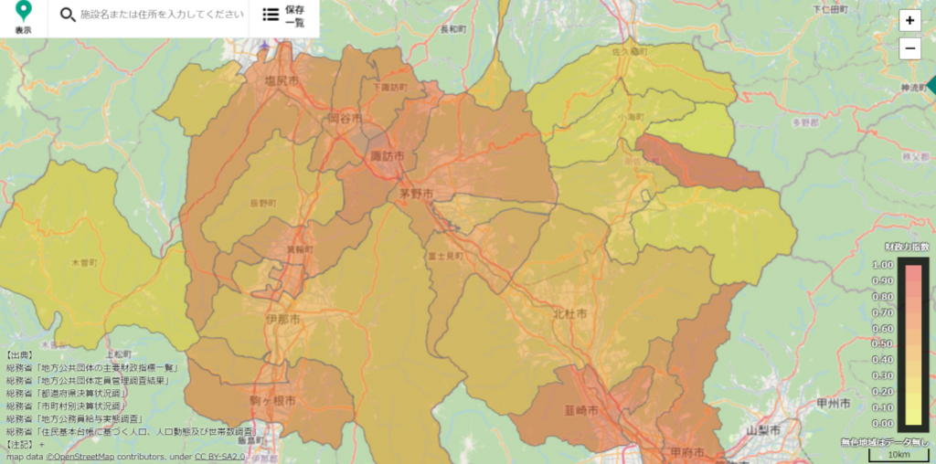 では、RESASで、八ヶ岳界隈の市町村の「財政力指数」がどのように表示されるかを実際に示してみよう。