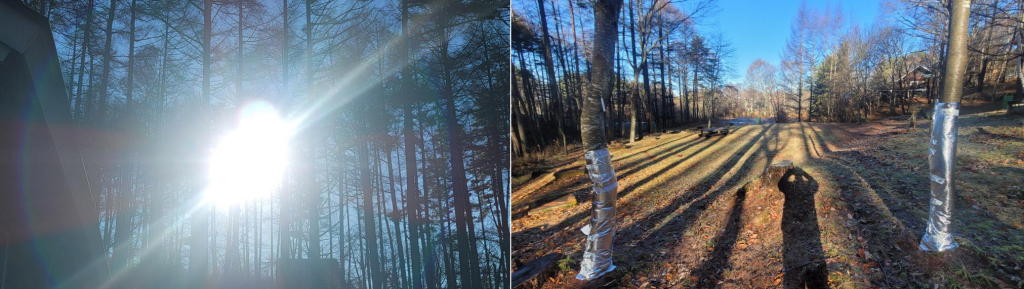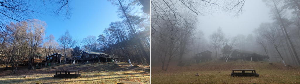左が今朝の写真。右の2日前の「霧の中」の写真と同じ場所とは思えないな…