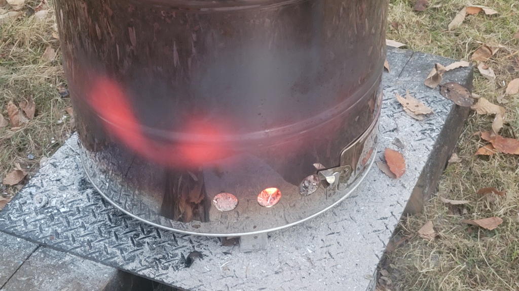 焚き火の炎を間近に楽しむという意味では「歴代最高」なのだが、落ち葉焚き用には小さいし、上蓋も無いので使い物にならない。