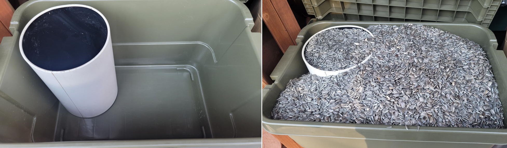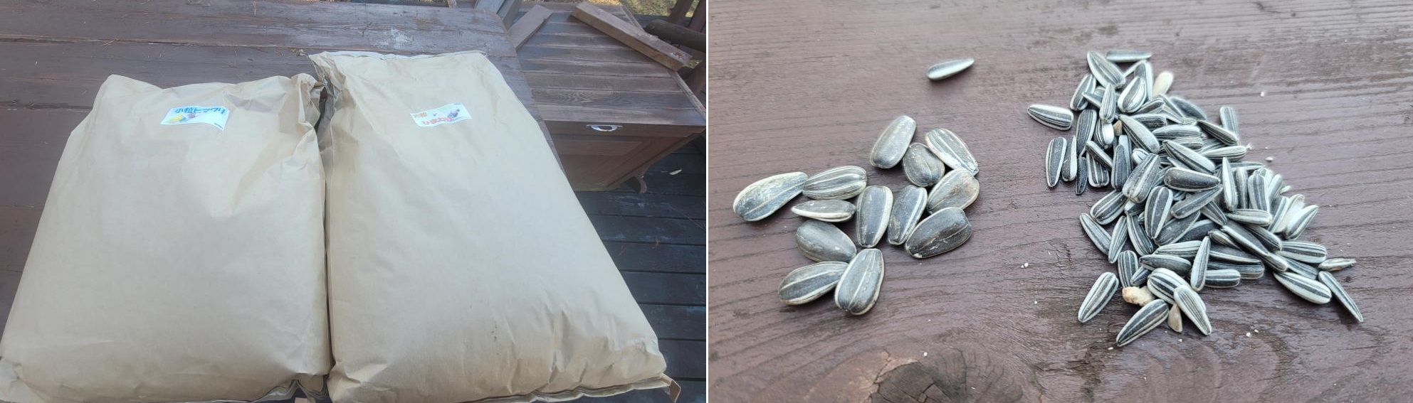 大粒と小粒、それぞれ10kg、計20kgのヒマワリの種をメインウッドデッキの上の作業台に運んで、専用のストッカーに混ぜながら流し込んでいった。