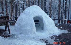 オイオイ、クリスマス前にメインウッドデッキで「かまくら」を作っているぞ!