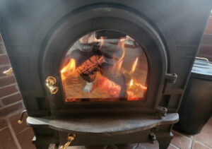 薪ストーブに付いているいくつかのレバーを操作してキャタリティック燃焼に切り替えると、薪の炎は熾火のような状態に変わって、燃焼時間が長くなるのだ。