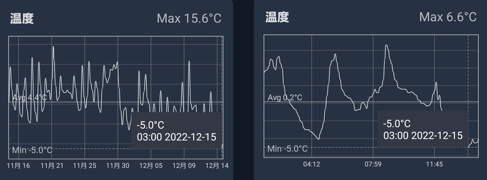 オフィスウッドデッキに設置した温湿度モニターは、今日の午前3時に「マイナス(氷点下)5℃」を記録していた。