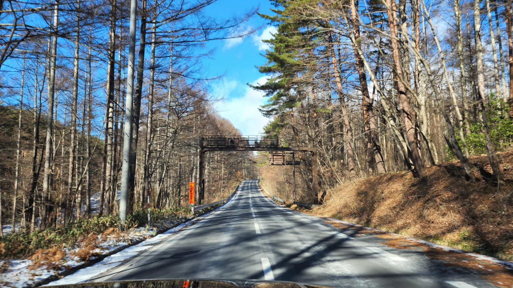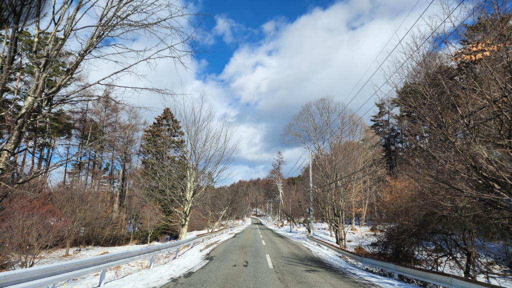 さすがに富士見高原リゾートを過ぎた辺りから、鉢巻道路沿いの別荘やペンションの敷地内に雪が目立ち始めた。