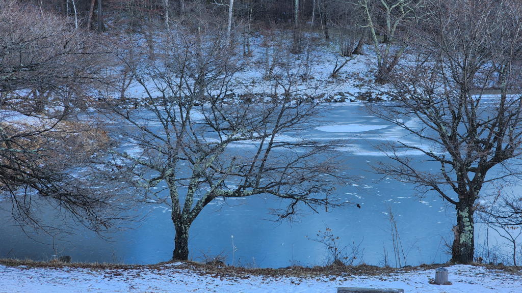 駐車場に出て「鹿の池」を眺めたら湖面が凍結していた。