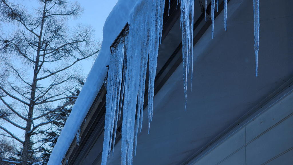 屋根から垂れ下がった「氷柱」の大きさは、八ヶ岳オフィスで見た事もない程の迫力だった。