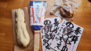 オフィスに戻って、身曾岐神社の羽子板お札と大滝神社のご朱印、和三盆のシュークリームとジャンボエクレアを並べてみた。
