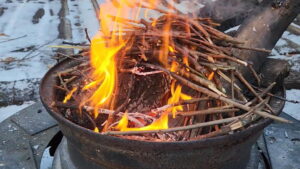快晴続きで焚き火用に使う残材・廃材は見事に乾燥しており、あっと言う間に火が育った。
