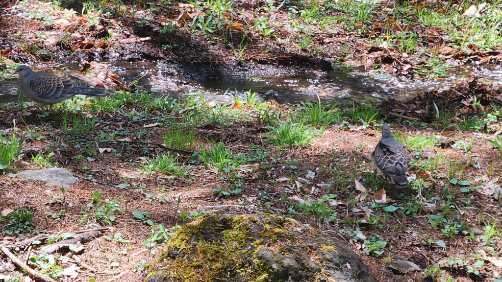 おっと、いつもは無い水の流れが物珍しいのか、キジバト夫婦が水飲みに来ているな…