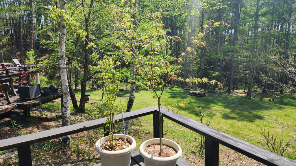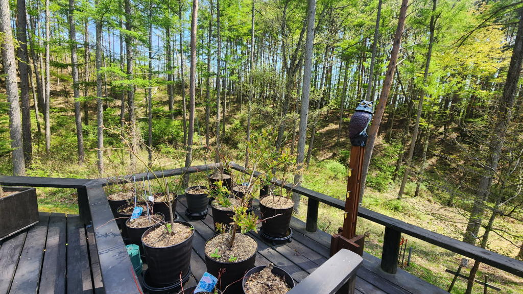 2018年の春に、敷地内で自生しているのを見つけて、鹿の食害から守ってオフィスのウッドデッキで鉢植えで育てた「楓娘」達。