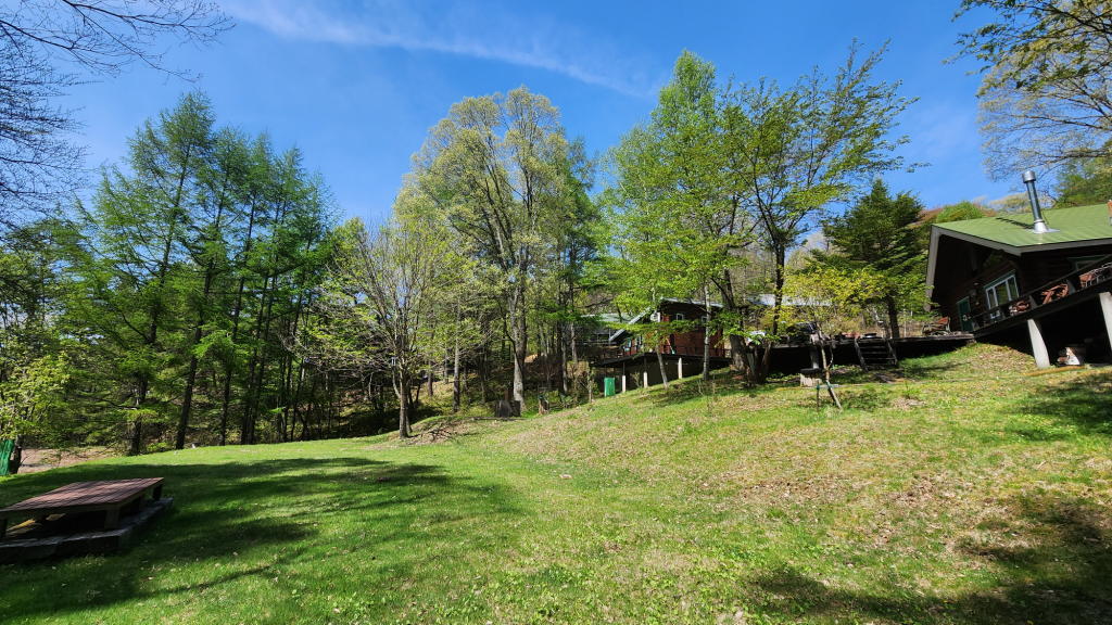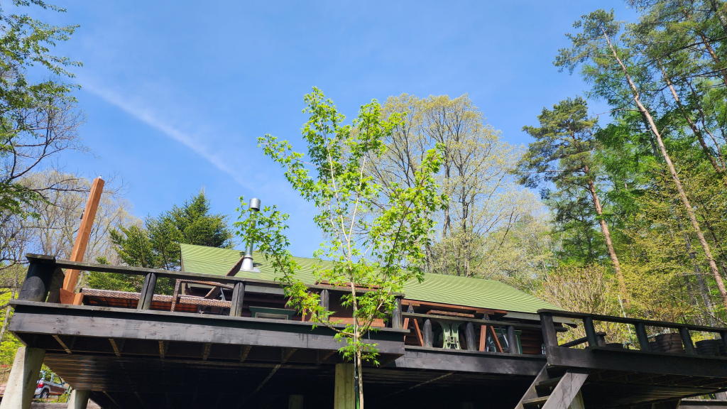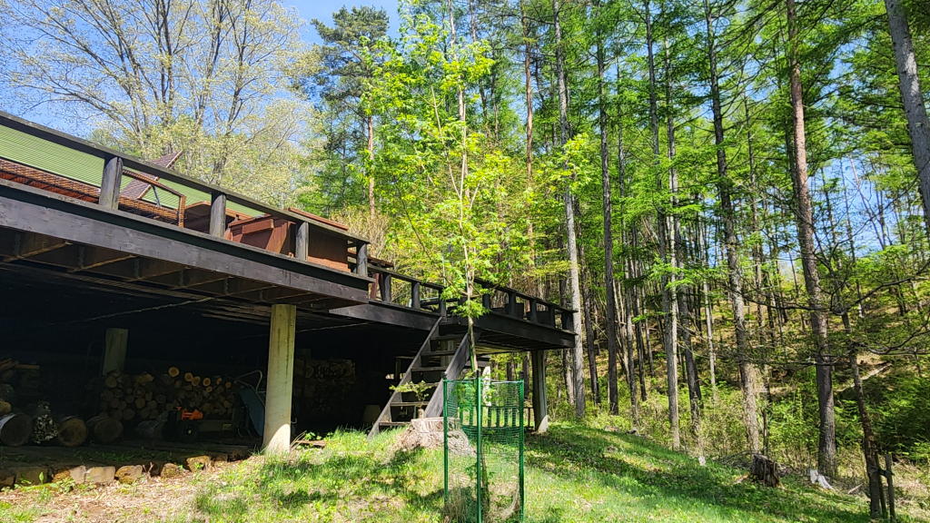 オフィスのウッドデッキは、2020年春の草刈りの際に同じく自生しているのを見つけた「2代目 三姉妹」のシェルターだ。