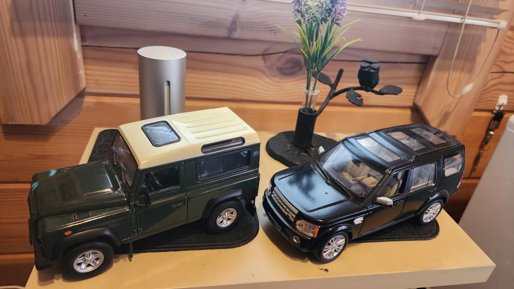 Land Rover の 旧ディフェンダーと社用車D4のミニカーもまるで洗車したようになったな。