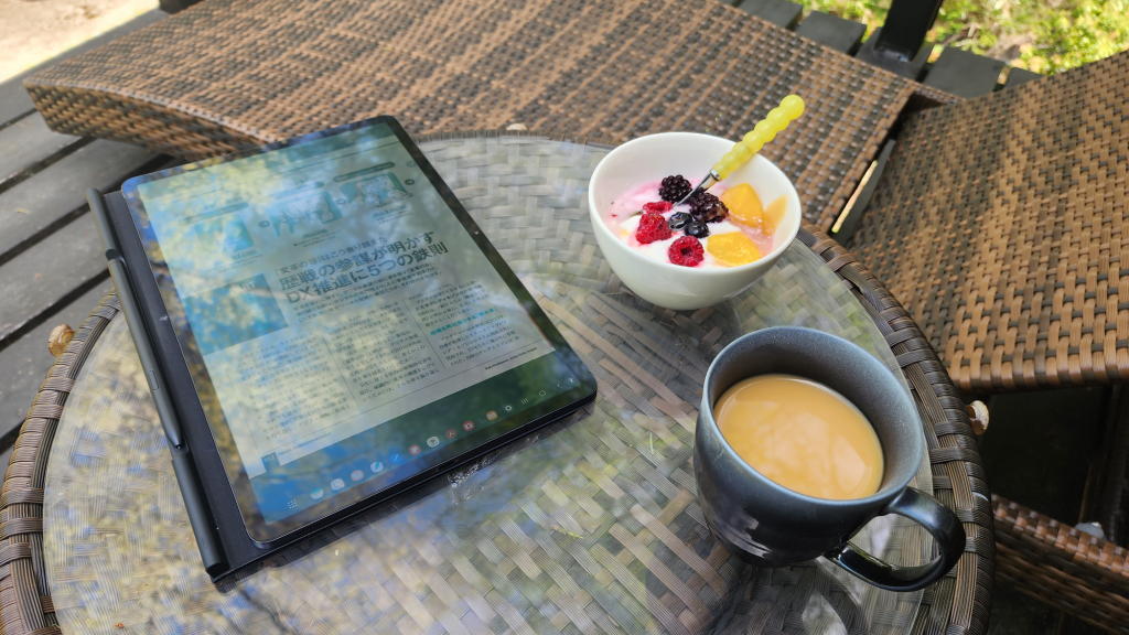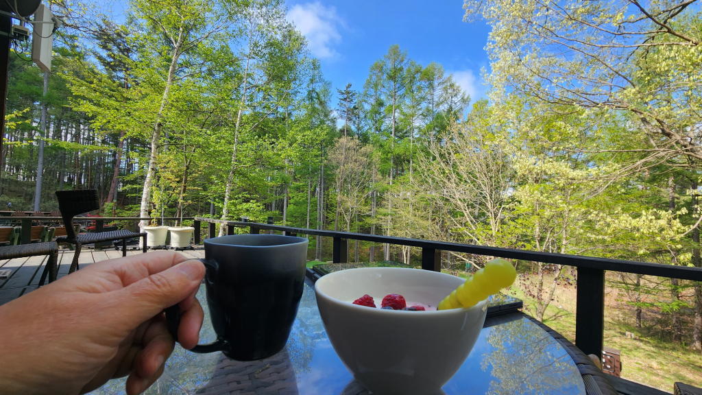 今朝も快晴。珈琲とヨーグルトの朝食は「お外」、オフィスのウッドデッキにしよう!