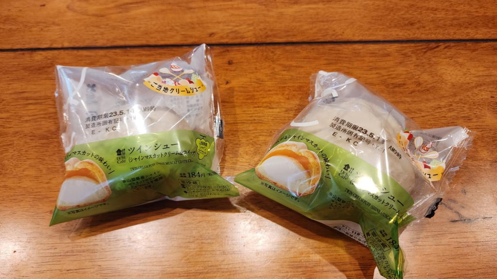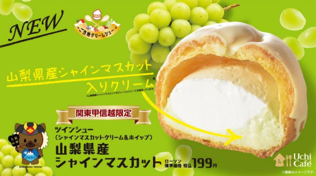 ローソンが5月9日から発売している山梨県のご当地シュークリーム「シャインマスカット ツインシュー」が私好みの味でとっても好きだ!