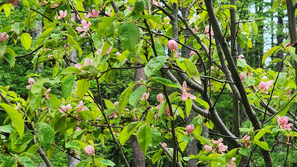 今朝は、敷地内では「カリン」、敷地と財産区林のほぼ境界線上では「深山桜」の開花が本格化していた。