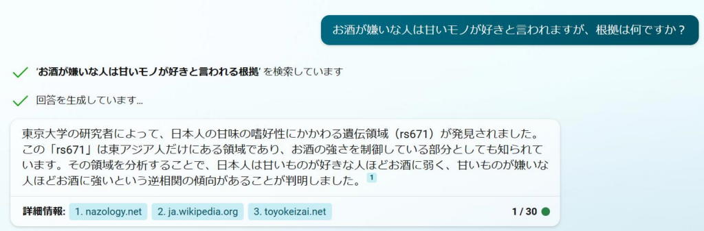 今度はすぐに「東京大学の研究者によって、日本人の甘味の嗜好性にかかわる遺伝領域(rs671)が発見されました。この「rs671」は東アジア人だけにある領域であり、お酒の強さを制御している部分としても知られています。その領域を分析することで、日本人は甘いものが好きな人ほどお酒に弱く、甘いものが嫌いな人ほどお酒に強いという逆相関の傾向があることが判明しました。」との回答が表示された。