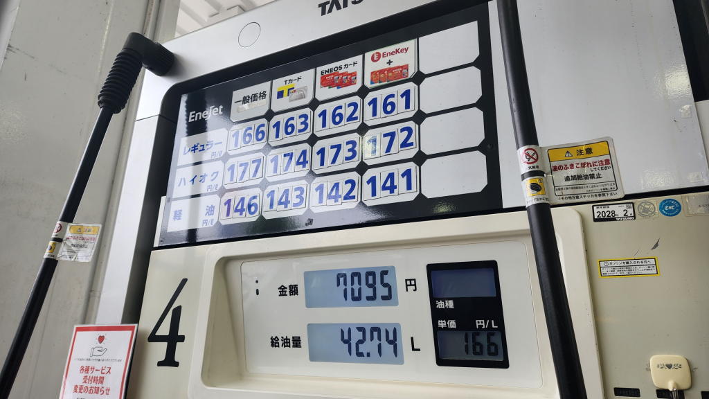 洗車の前にまずは給油。ハイオクがリッターで166円。