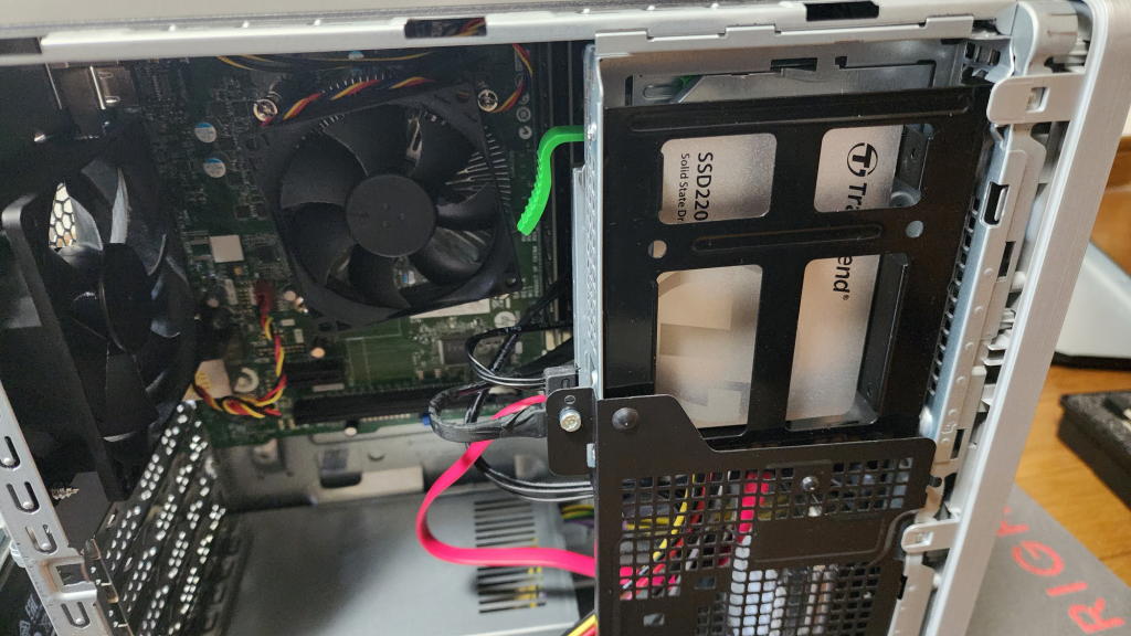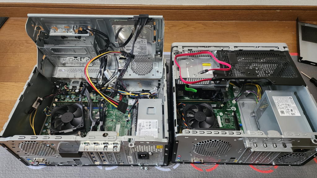 取り寄せたケーブルを繋ぎ、ドライブベイを小細工しながら増設用のSSDをそれぞれのPCに取り付けた。