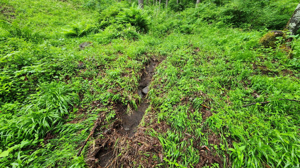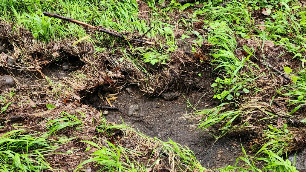 地面が水の流れでえぐれた跡を見るのは何年ぶりかな?