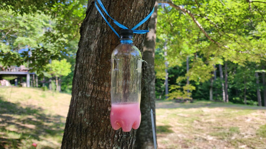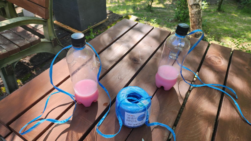 ④ 2リットルの大型ペットボトルよりも、500~600ccのペットボトルの方が、何故か、これまでは蜂の捕獲数が多かった。理由は不明だが、誘因液の香りがより濃密になるのかもしれない。