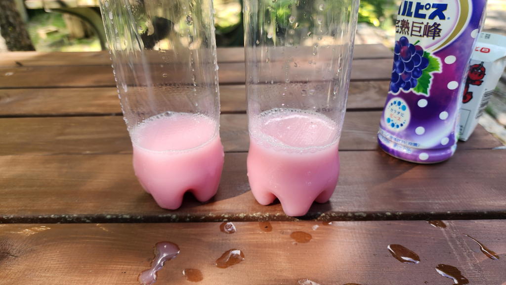 ⑥ 柔らかめの素材のペットボトルは何者かに破壊された。炭酸飲料の固いペットボトルの方が安心できる。