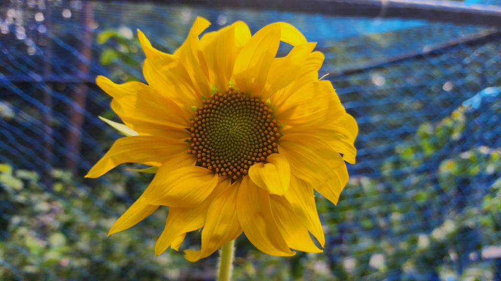 ブルーベリー小屋の前では、野鳥が種を運んできたヒマワリが開花していた。