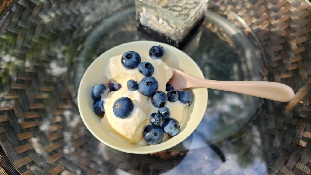 ブルーベリーをバニラアイスにトッピングして、ガーデンベッドに寝転がって味わう。