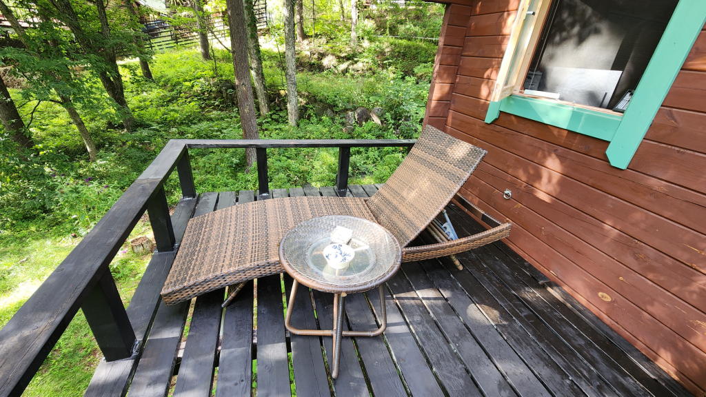 調温調湿効果に優れたログハウスの室温は、日中の暑さの盛りでも、せいぜい28℃程度にまでしか上昇しない。