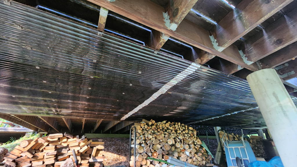 ついでに、メインウドデッキ下の薪置き場の雨除け(ポリカの波板)のコーキングとビス打ちもやり直しておこう。