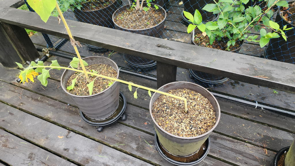 と思ったら、メインウッドデッキで鉢植えのヒマワリが1本折れているのを発見。