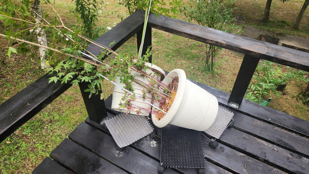 おっと、オフィスのウッドデッキでは、楓姉妹の四女と五女の鉢が倒れているじゃないか。