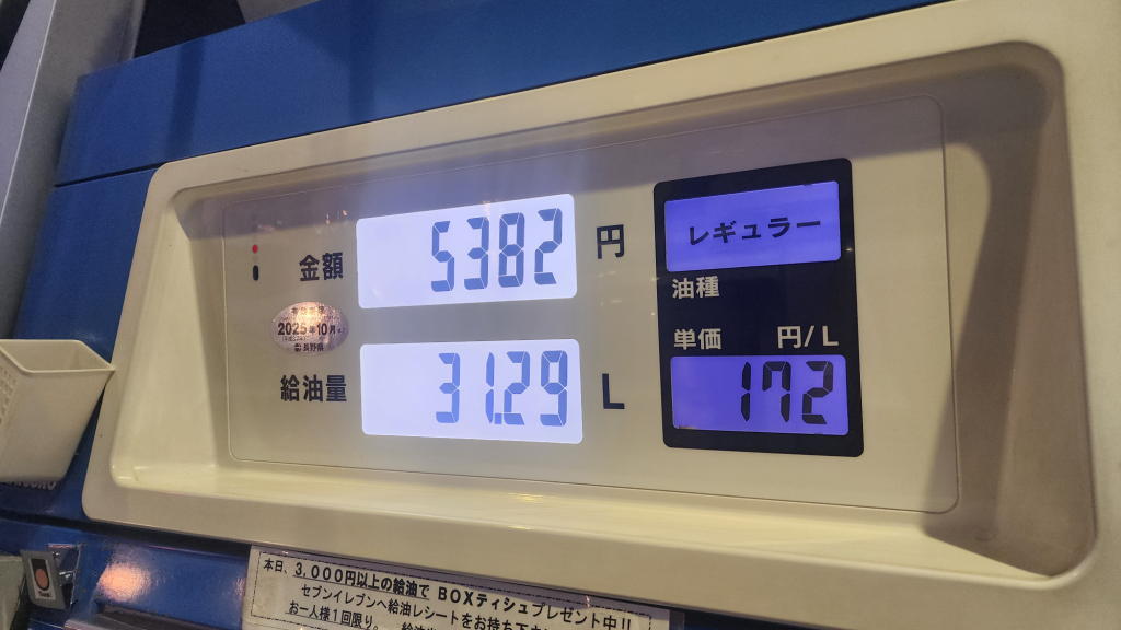 ニュースではガソリン価格の高騰を連日報道しているが、レギュラーでリッター172円(+ティッシュ1箱プレゼント)だった。