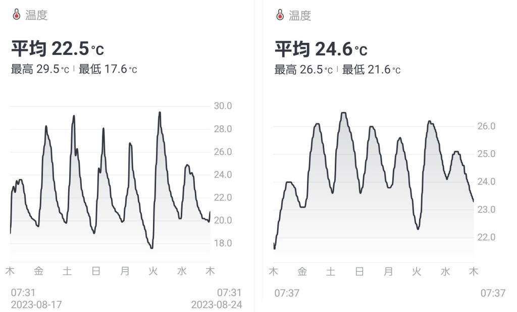 平均室温は24~25℃なので本当に過ごしやすく、湿度は55%程度で湿度計が壊れているんじゃないかと思える程、安定推移。