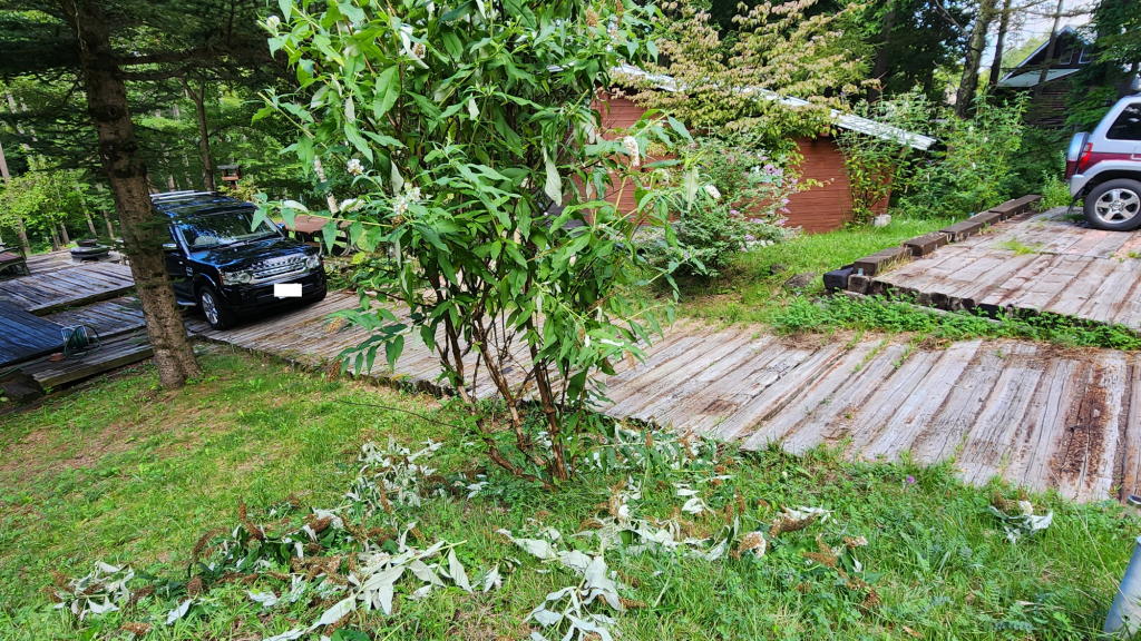 朝の内に、もう茶色になってしまったブッドレアの花穂(花がら)と枝の剪定を行った。