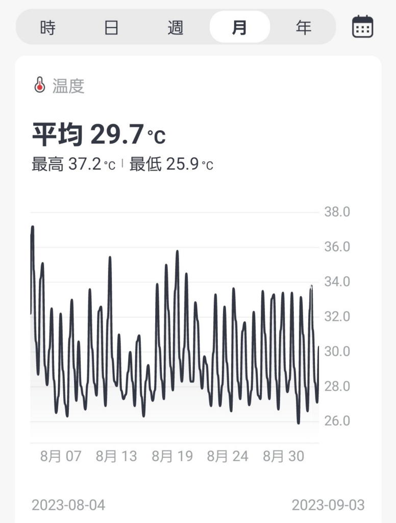 この1ヶ月間の新百合ヶ丘自宅外気温の最高は 37.2℃、最低は 25.9℃、平均が 29.7℃。