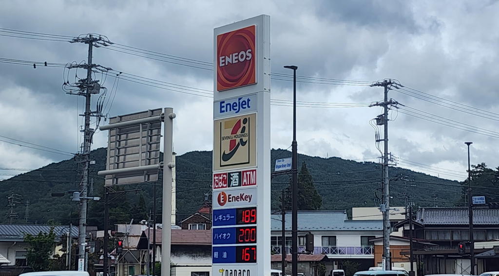 ガソリン価格の大型表示灯は「レギュラー 189円・ハイオク 200円」と示していた。